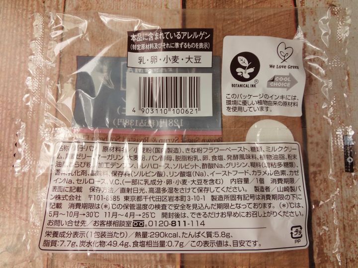 原材料と栄養成分表示はこちら。1個のエネルギーは290kcalです。