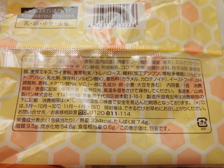 原材料名と栄養成分表示はこちら。1個のエネルギーは334kcalです。