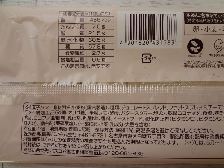 原材料名と栄養成分表示はこちら。エネルギーを確認したところでビックリ!!デニッシュ生地なので高めだとは思いましたが458kcalには驚きです。1人でペロッと食べるには勇気がいります。