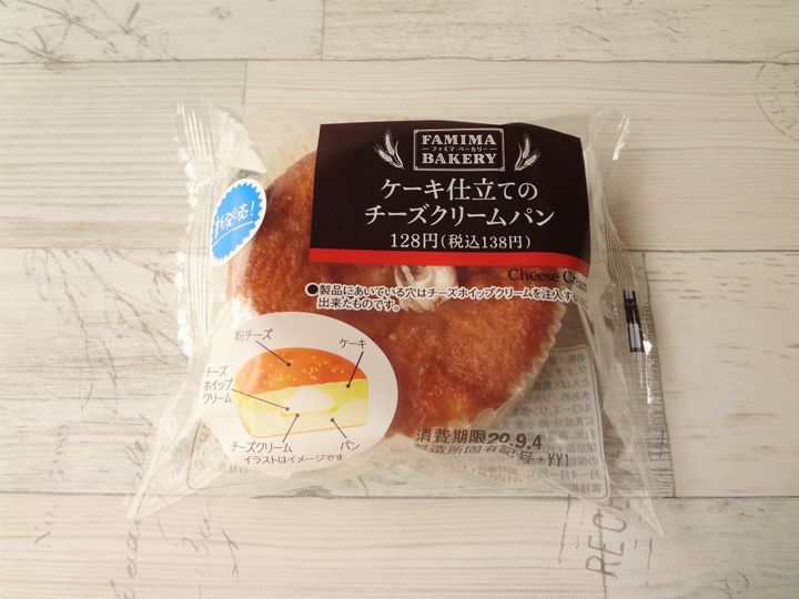 ファミマベーカリーの「ケーキ仕立てのチーズクリームパン」は128円(税抜)です。