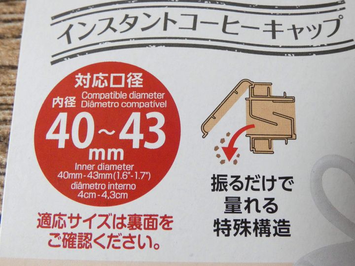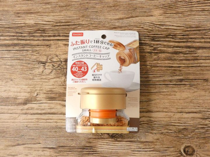 インスタントコーヒーキャップはダイソーで100円(税抜)。特殊なキャップで、ふた振りで1杯分のコーヒーが量れるグッズなんです。