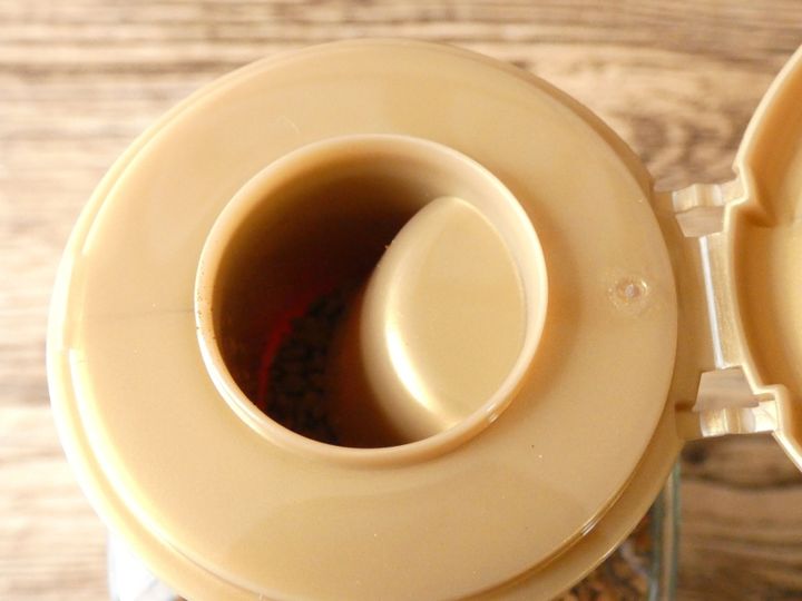 まずはインスタントコーヒーのビンにキャップをセットします。一度逆さまにすると容器内に一定量がたまり、もう一度逆さにするとたまったコーヒーが出る仕組みになっているんですって。