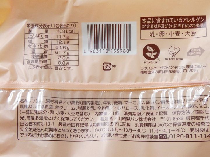 栄養成分表示を見ると1個408kcalありました。クリームが入っているパンではないのに、カロリーはかなり高めでビックリです。