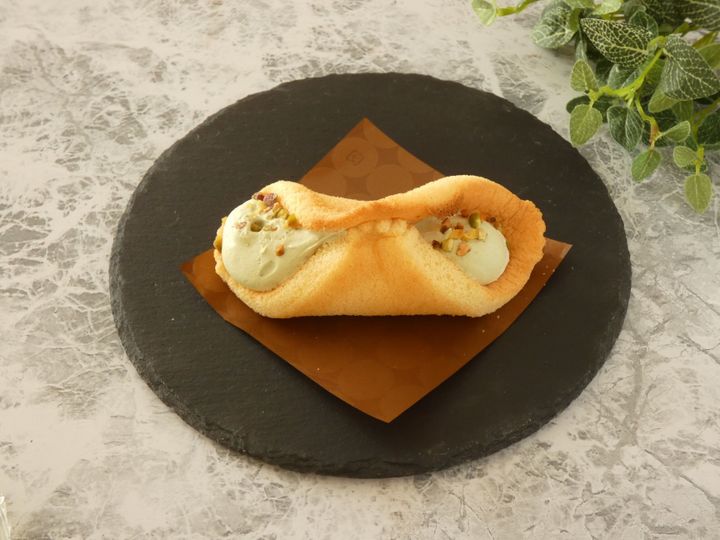 たっぷりのピスタチオクリームがスポンジにくるんと包まれていて、クリームにはピスタチオがたっぷり乗っています。