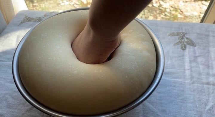7.丸めた生地の中央に指を入れて穴をあけ指でくるくると外側へ穴を大きくする。