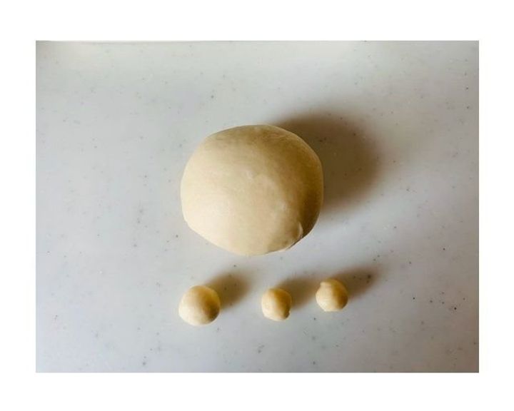 8等分した1つの生地から、耳1つ1gを2つ取り、鼻1.5gを1つ取りそれぞれ丸めます。