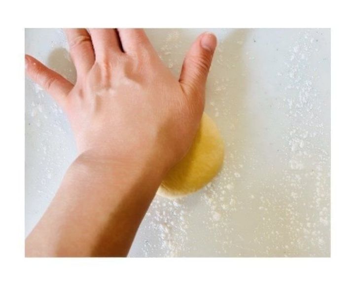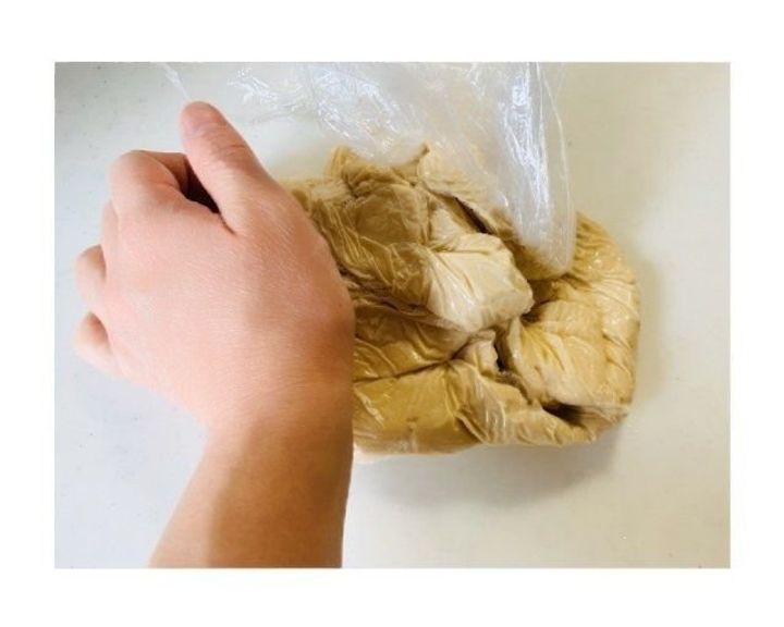 次第にまとまってきたら、親指の付け根あたりから手首にかけての部分で力を入れて約10分こねる。