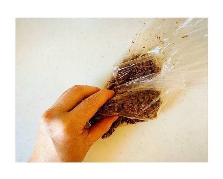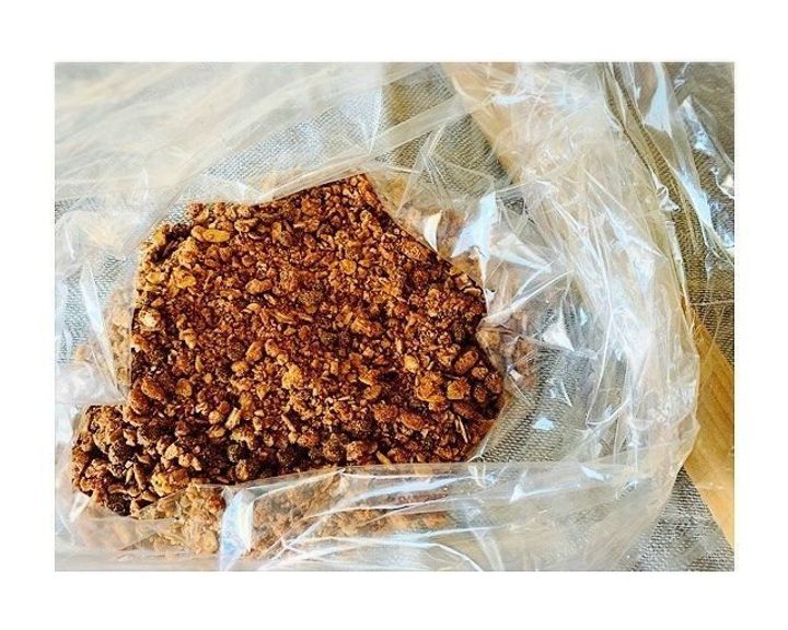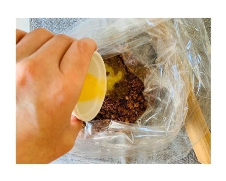 溶かしたバターを細かくしたシリアルの上に流し入れ、袋の上からもみこみバターがまんべんなくいきわたるようにする。