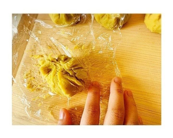3.生地を8等分して、かたく絞ったぬれぶきんで包み、しぼります。