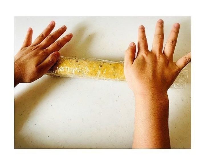 5.台にラップをしいて、その上に生地を取り出して長さ30cmの棒状にします。
