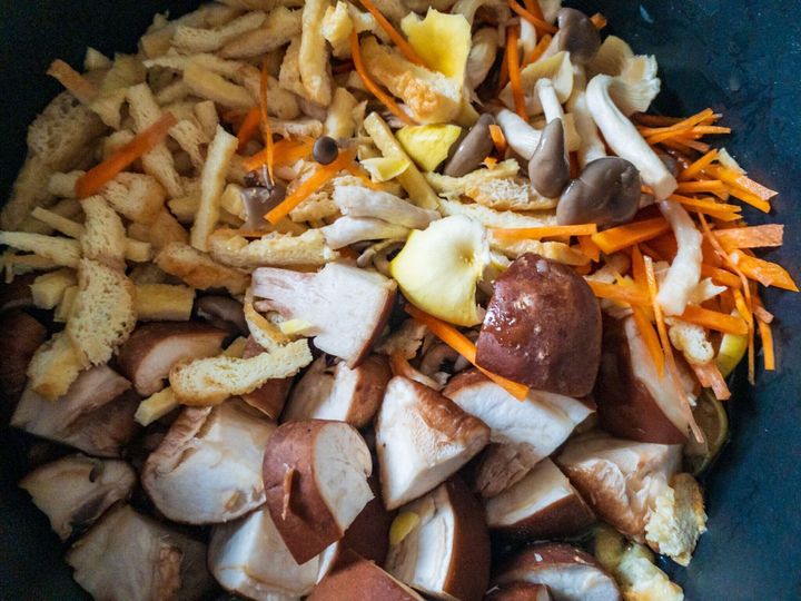 1.きのこ類の下処理をする。しめじの石づきをとり、全てのきのこを食べやすい大きさに切ったり、房を手で分けサッと洗う。