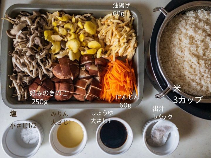 ※きのこから水分が出るので米の水加減はお好みで調整してください)