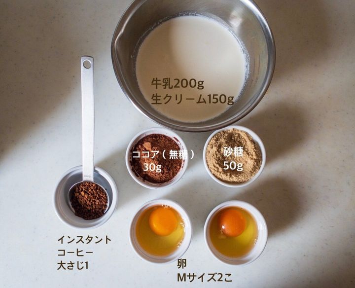 今回はショコラプリンなので、ココアと濃厚にするため生クリームを使用、隠し味にインスタントコーヒーをいれてちょっと苦味を足して大人なショコラプリンにしあげます。