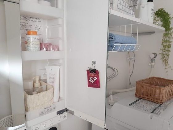 洗面台の扉の裏には試供品で貰った化粧品等を掛けています。
