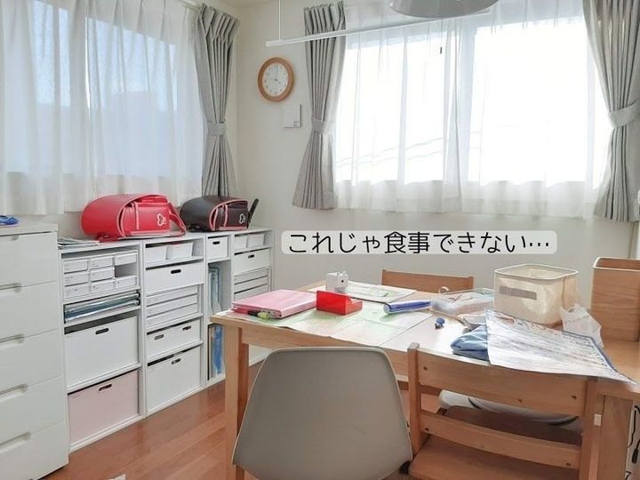 勉強の途中に夕食の時間になった時にダイニングテーブルの上を一度片付ける必要があります。勉強の後は消しゴムのかす等も散乱しているのでリセットが必要。一旦退避させるスペースを作るか(ボックス等に入れる)そもそも最初からダイニングスペースの近くに(リビングでも)学用品置き場を設けて定位置に戻すとスムーズに食事に移れます。我が家の場合、ダイニングスペースに子供の学用品、洋服、バッグ類等のほぼ全てのグッズを置いています。
