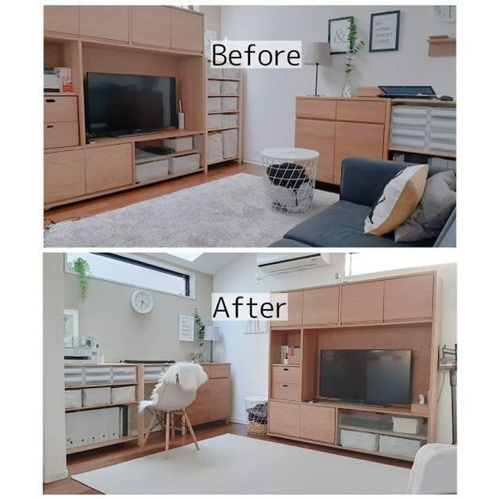 今まではリビングに入ってすぐ奥に大型家具を置いていました。造り付け収納の無いリビングなので我が家の貴重な収納スペースです。しかしどうしても圧迫感があります。大きな家具はなるべく部屋の手前に置き、低い家具は部屋の奥に置くと部屋が広く見える効果があります。ソファが無くなった事で家具の配置の自由度が増しました。更に奥の家具の高さを揃える事で見た目もすっきりしました。今までおもちゃを入れていた無印良品のパイン材ラックを自分でカットして高さを揃えました。