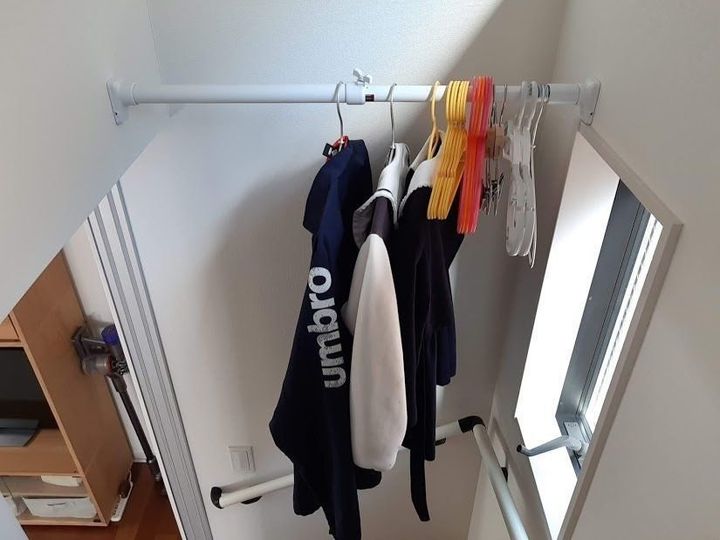 家族がリビングにものを持ち込むと部屋が散らかりますよね。特にアウターや衣類をダイニングチェアやソファに掛けると一気に部屋は雑然とした雰囲気になります。見た目も悪いし座り心地も悪くて良い事なし!我が家も夫や子供がリビングにアウターや衣類を持ち込む事があるので階段に衣類の一時置き場を作っています。