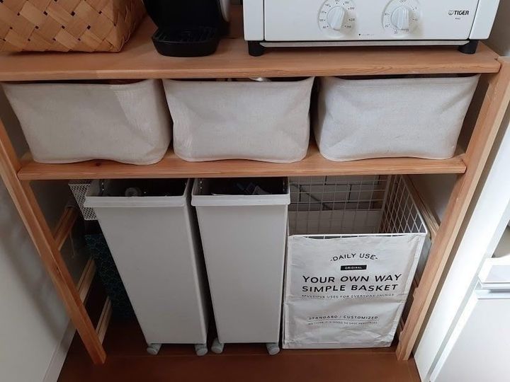 家にあった100均のワイヤーネットを結束バンドで繋いでセリアのランドリーバスケットを外側に巻いて簡易ゴミ箱を作成。キッチンスペースにゴミが溢れずに使用出来ています。期間限定で作ったつもりが家族からは使いやすいと好評でした。今後キャスターを付けて更に使いやすくする予定です。無印のゴミ箱は資源ごみや不燃ごみ用として使用しています。