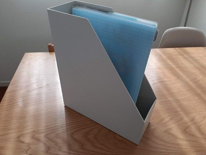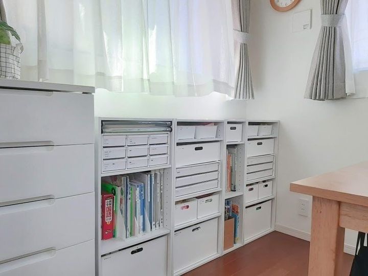 学用品を収納ケースにまとめる場合は、浅い収納ケースだと教材を重ねて入れてしまい下の方の教材を忘れてしまいます。立てて収納が出来るファイルボックスの方が全体が見えるので子供が管理しやすいです。