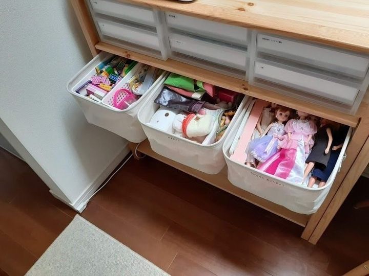おもちゃもよく使うものだけリビングに残して後はまとめて別の場所に。大きな収納ケースに入れてリビングに置いていると、一つのおもちゃを出すのに全部ざーっと出されて散らかります。逆に休校期間中使うようになったボードゲームやカードゲームは取り出しやすい場所に収納を変更。使いやすく散らかりにくいリビングに変わります。