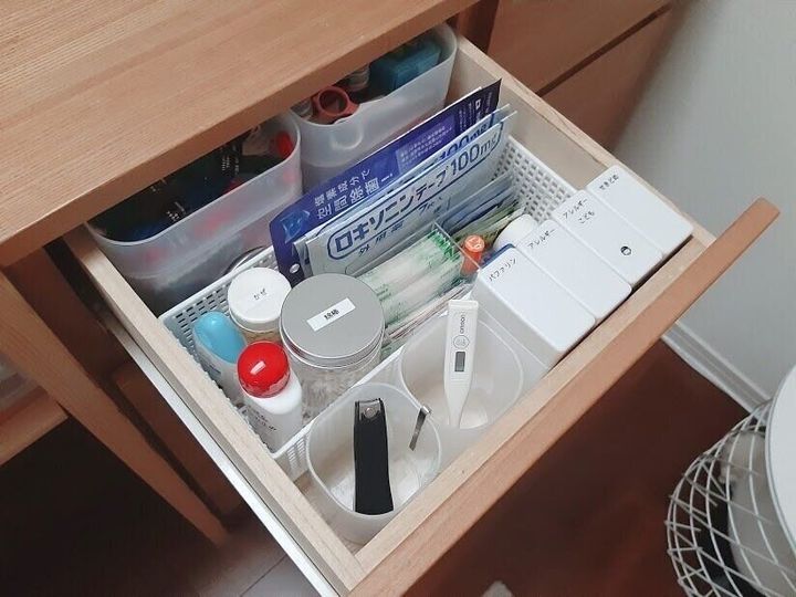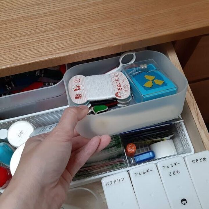 裁縫箱と同じく薬類もボックスに収納していましたが引出し収納に変えました。常備薬はセリアの常備薬ケースに収納し、他も仕切りを付ける事で使いやすくしています。ボックスで使用していた時よりもアクション数が減ったので家族が使用しても元に戻してもらいやすくなりました。薬にも使用期限があるので定期的にチェックして見直しています。病院で処方されたお薬は基本飲みきるのでこちらとは分けています。冷蔵庫の側面にマグネットで付けて飲み忘れを防止しています。