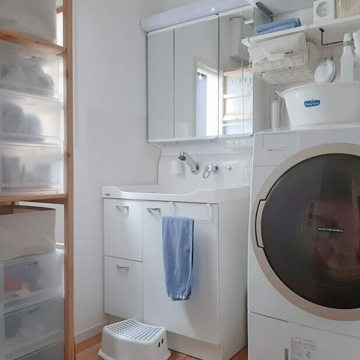 基本、ベランダに洗濯物を干しません。我が家の洗濯ルーティーンは、夜寝る前に乾燥出来る衣類だけを洗濯乾燥機に入れてスイッチオン。朝起きたら乾燥まで済んでいます。(乾燥できない衣類は別で洗濯してお風呂場に干しています)朝一の家事は洗濯物の仕分け。タオルや下着や部屋着などは脱衣所に収納しているので動線が短く戻すのが楽です。子供の洋服とキッチンクロスなどだけ2階のリビングに持って上がりますが少量なので直ぐに戻せます。朝一に洗濯が終わっているとシーツやマット類を洗いたい時もスムーズに洗濯することができます。