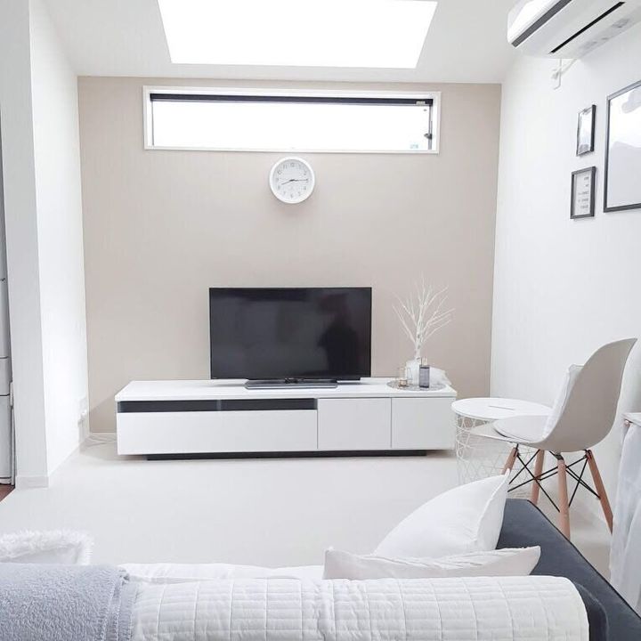 新しいテレビ台は高さを低くして色もホワイトに。もともとソファはローソファでしたので相性も抜群です。