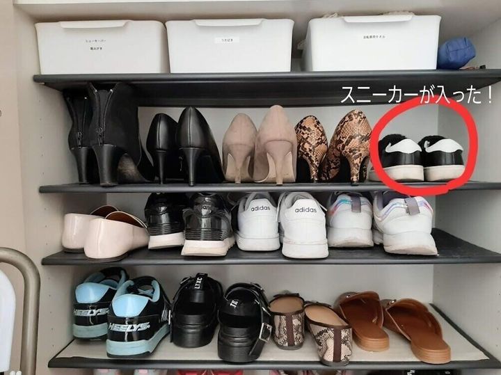 右側にスペースが空きました。スニーカーよりパンプスの方が形状でスペースを節約しやすいです。スニーカーの横にも若干スペースが空きました。