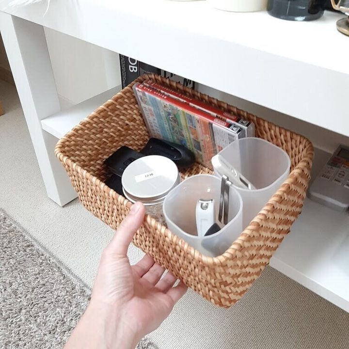 更に一日に何回も使用するものは、リビングに座っている状態ですぐに手の届く場所に置いています。リモコン、ティッシュ、ゲーム、爪切り、綿棒は家族も私もよく使うのでかごにざっくりと入れて取り出しやすく戻しやすい収納にしています。