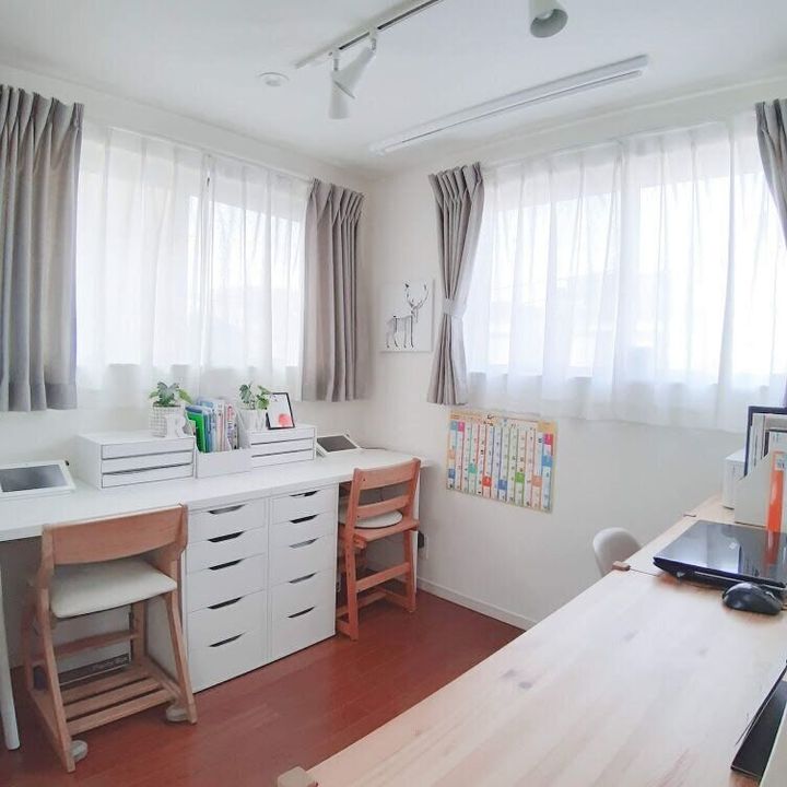 リビングが散らからない為に、ダイニングスペースに個人のものを置くスペースを設けています。子どもたちのものは学習コーナーに全て収めています。