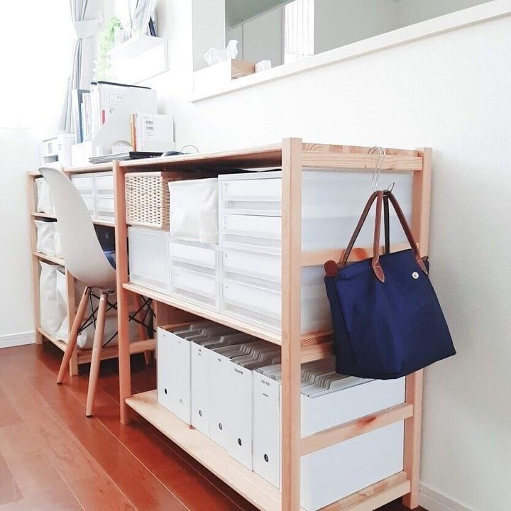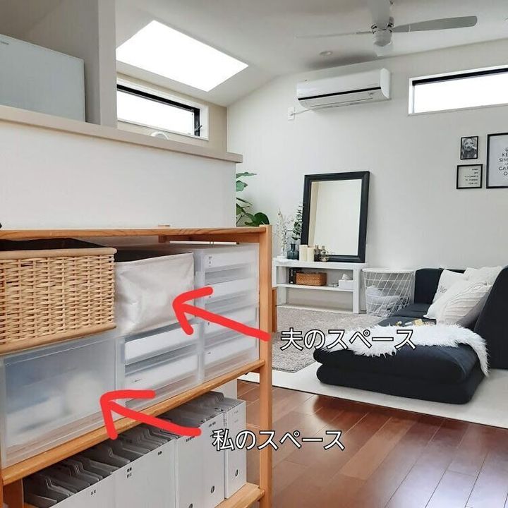 夫と私のものはワークスペース周辺に。入っていればOKという緩いルールでノンストレス。