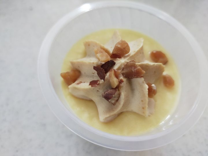 プリンだけでなくキャラメルナッツクリームを乗せてしまうのが美味しさの秘訣です。もちろんプリンも後を引くお味です。