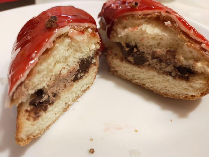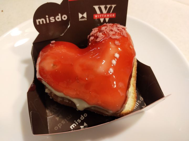 ルージュハートは、ガナッシュクリームとガナッシュホイップがサンドしてあるのですが、ホワイトチョコと真っ赤なグラサージュが少し甘さを控えた大人味のガナッシュクリームとホイップに合うんです。贅沢な味が口の中に広がりました。