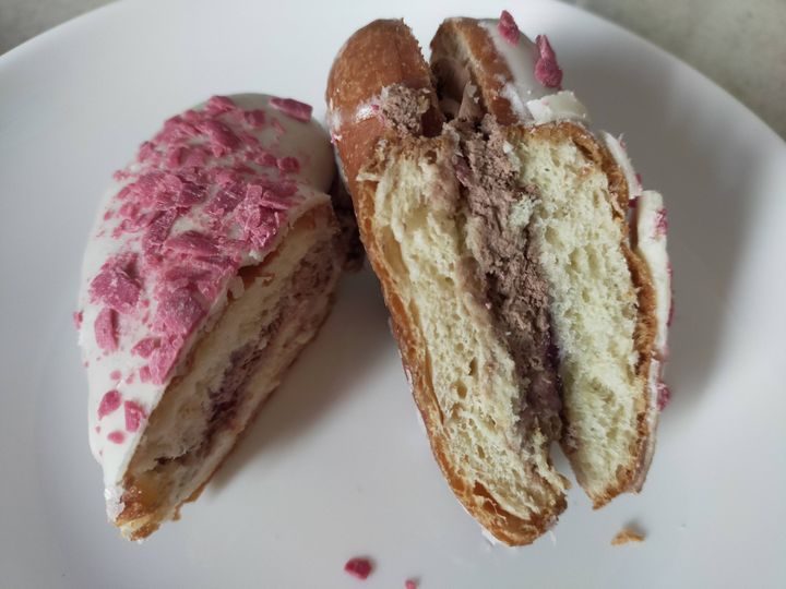 ブルーベリージャムがアクセントとなっており、少しフルーツの酸味が効いた味が生地とホワイトチョコに合います。もちろんガナッシュクリームもたっぷりです。
