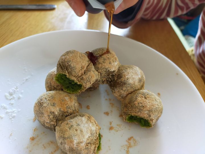 好みに調節しながら垂らす幸せともっちり抹茶ときなこ。
