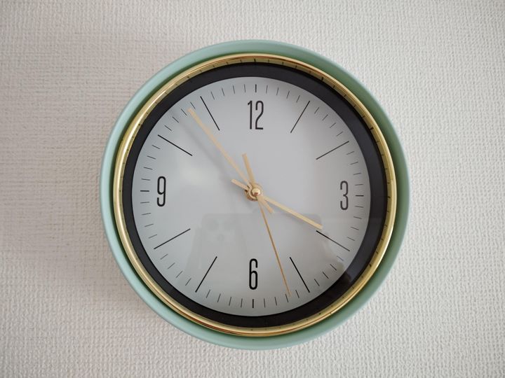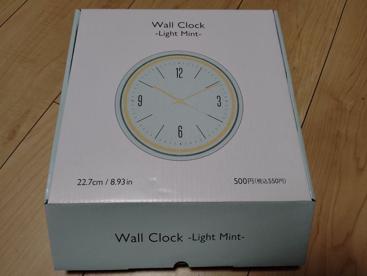 店頭に飾られた壁時計。色は3種類でこちらはライトミント。