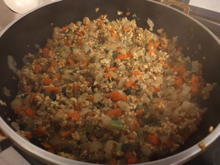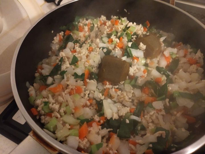 野菜を細かく刻んで炒めた仕上げにルーを半分入れて蓋をすると、野菜たっぷりドライカレーに!