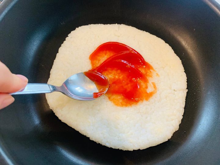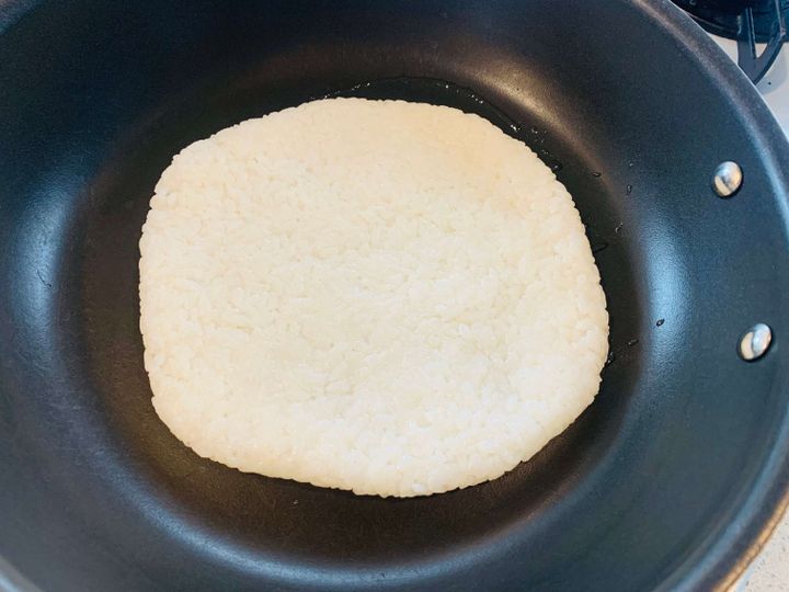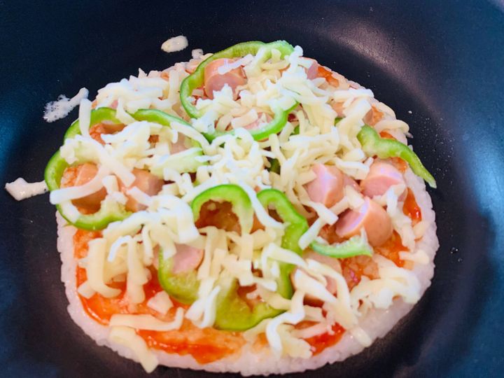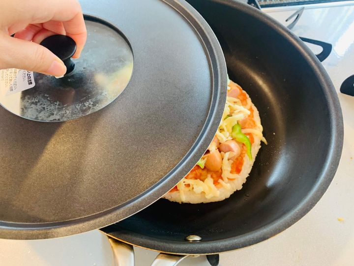 フライパンに油を入れて熱し、ごはんピザの生地を焼きます。中火で3分焼いたら返してさらに3分焼きます。