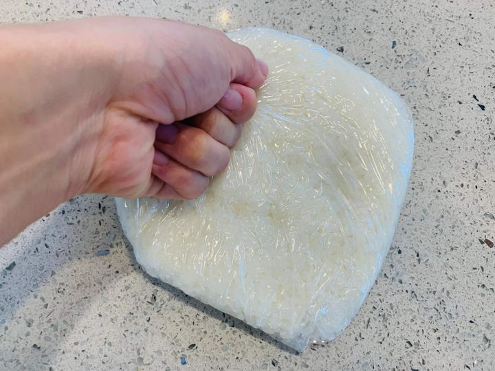 ごはんの生地をラップにつつみ、グイグイ押すように平らにならします。この時強めにおすことでモッチリまとまるので、捏ねるように押し付けると上手くいきます。