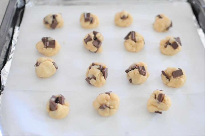 まん丸にしなくても、チョコが飛び出ている感じでOKです。チョコが上に出ている方が美味しそうに焼けますよ。