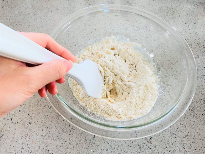 ゴムベラか手で、粉気がなくなりひとまとまりになるまで混ぜます。どうしてもまとまらない時は、少し牛乳をプラスします。