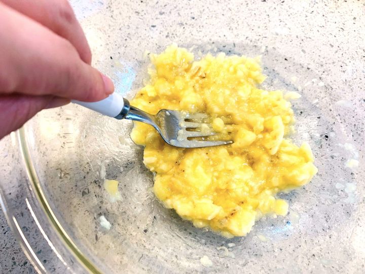 ボウルにバナナを入れて、フォークでしっかりつぶします。