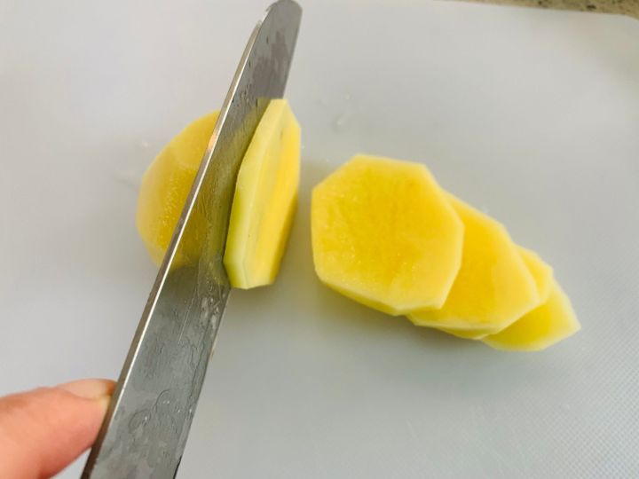 じゃがいもは皮をむいて、5㎜幅くらいに切ります。