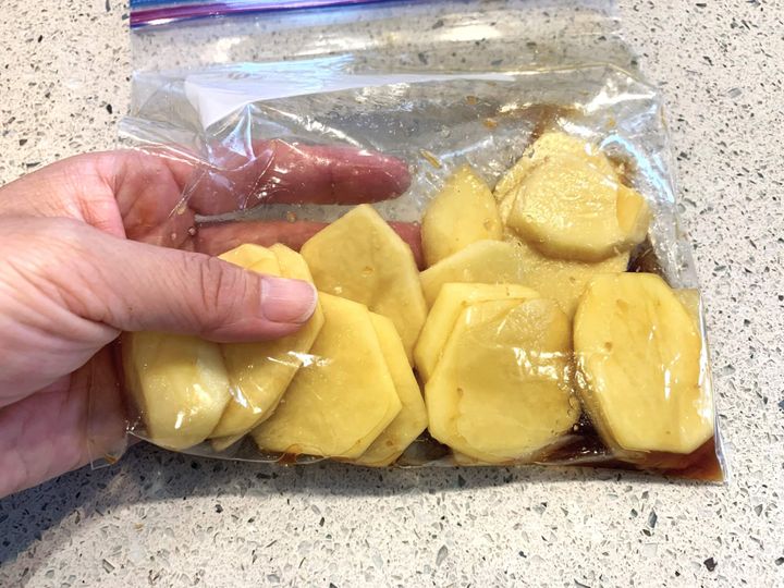 じゃがいもと調味料をポリ袋やジップ付き保存袋に入れます。