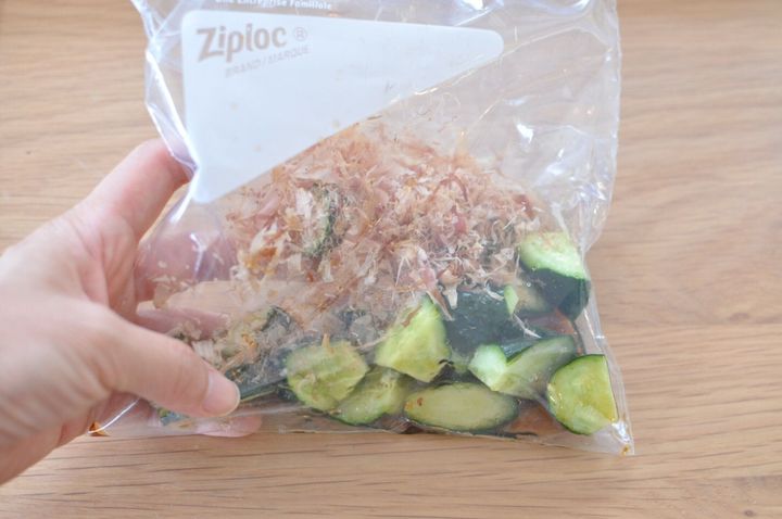 かつおぶしを加えると、タレがきゅうりにしっかり絡んで短時間の漬けこみで美味しく仕上がります!
