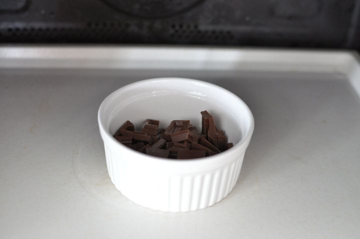 小さく切った板チョコを耐熱皿に入れ、ラップをせずに電子レンジ600Wで30秒加熱します。