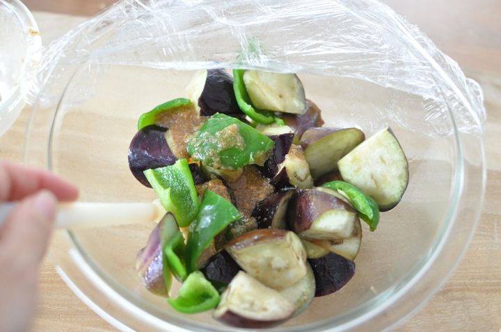 レンジからボウルを取り出します。調味料Aを混ぜ合わせ、なすとピーマンに加えます。