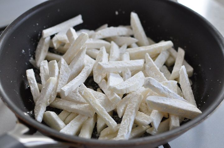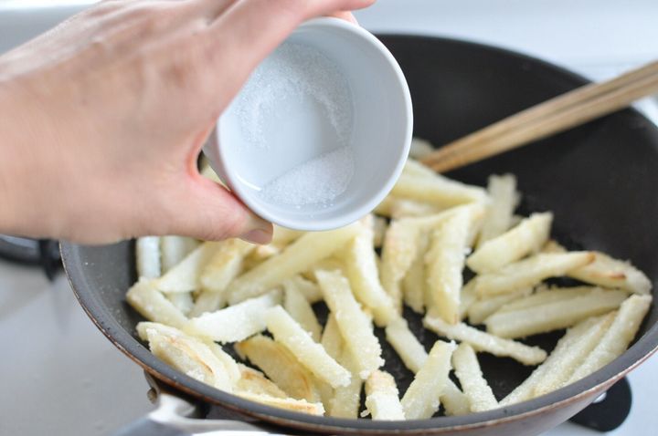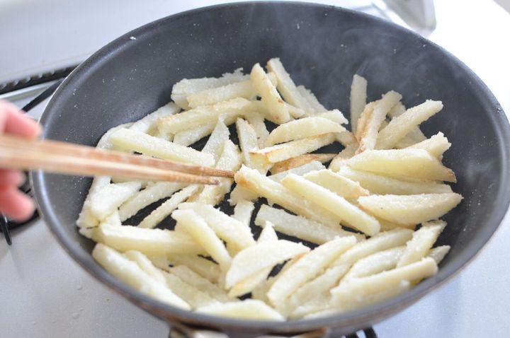 細いほどカリカリ感が増して、太いほどホクホク感が感じられます。細い方が早く仕上がるメリットも。