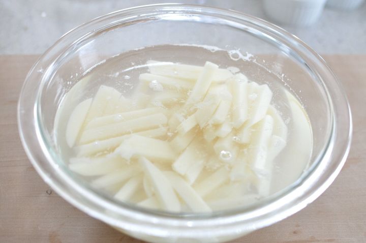 切ったじゃがいもは15~30分ほど水にさらします。水にさらしておくと、揚げ焼きしてもベチャっとなりにくくなるので、この工程は逃せません!