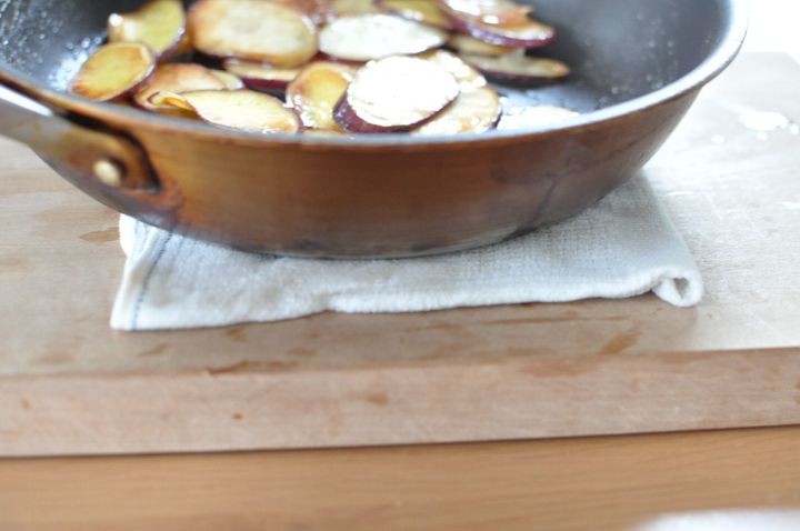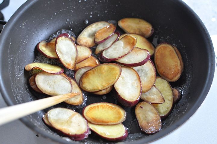 火からおろし、濡れ布巾の上にフライパンをのせて鍋底を冷やします。冷やすことで、さつまいもに絡めた蜜が結晶化して、少し白っぽく仕上がります。